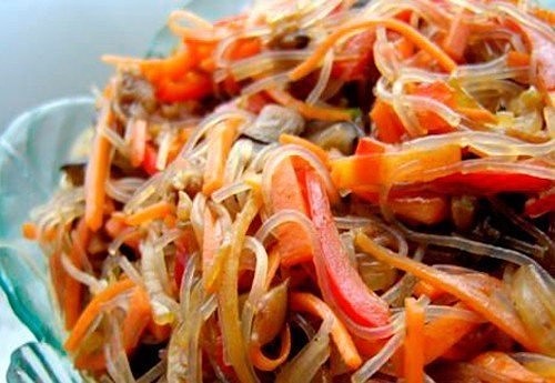 ПРИГОТОВЛЕНИЕ: Фунчозу залить кипятком на 5-7 мин., откинуть на дуршлаг и промыть холодной кипячёной водой. Все овощи, кроме чеснока и зелени, нашинковать тонкой соломкой, зелень и чеснок мелко порубить. Нашинкованную морковь перетереть руками до появления сока. Все продукты соединить и хорошо перемешать, затем оставить на 2 часа на холоде для настаивания, перед подачей на стол ещё раз тщательно перемешать.