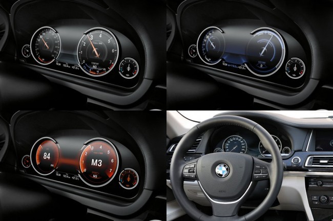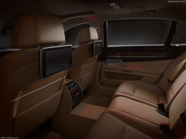 В салоне обновленной BMW 7 2013 можно отметить новый дизайн передних кресел, новую 1200-ваттную аудиосистему Bang & Olufsen объемного звучания, а для задних пассажиров опционально предлагается развлекательная система с двумя 9,2-дюймовыми мониторами. Еще одно нововведение было позаимствовано у БМВ 5-серии F10, появившееся на последней в начале мая 2012 года. Это цифровая приборная панель, предлагающая на выбор четыре различных варианта ее оформления.