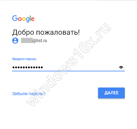 Вводим свои данные. Обратите внимание на то, что можно авторизоваться не только через почту gmail.com, но через любой привязанный к ней аккаунт. В данном случае мы воспользовались адресом с сервиса mail.ru. На сайте mail.ru эти два ящика были связаны между собой.