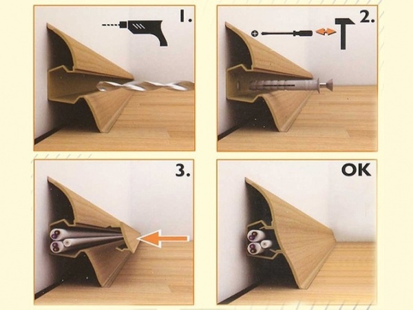 Плинтус с каналом для проводов укладывается на полу по такому же принципу, как и остальные. Единственное отличие, это укладка проводов внутри планки. Провода можно укладывать в канал, находящийся над саморезами либо после установки конструкции. В образовавшийся канал укладываются провода, планка устанавливается на свое прежнее место. Дополнительные отверстия для проводов проделываются в местах соединения.
