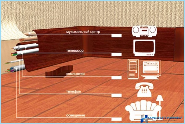 Пластиковый плинтус имеет маленький канал для кабеля, поэтому крепить провода, которые будут служить долгое время, следует под плинтус, а все остальные во внешний канал.