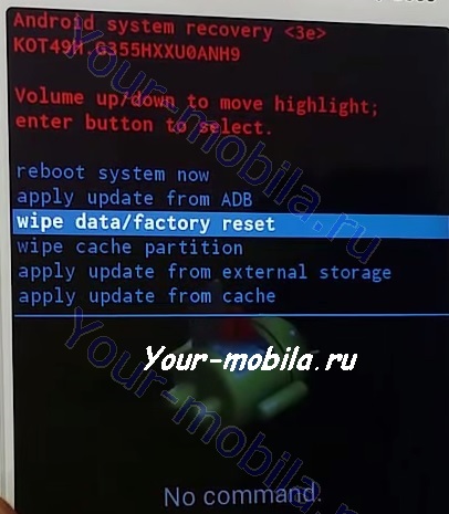 Нажимая клавиши «Громкости», ищем «wipe data/factory reset». Запускаем «Питанием».