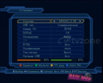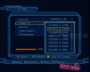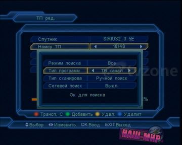 В пункте “Номер ТП” нажатием кнопки “ОК” выберите транспондер с указанными выше параметрами. Если вы не нашли необходимую вам частоту, то это можно исправить в ручном режиме нажатием зеленой кнопки “Добавить транспондер”.