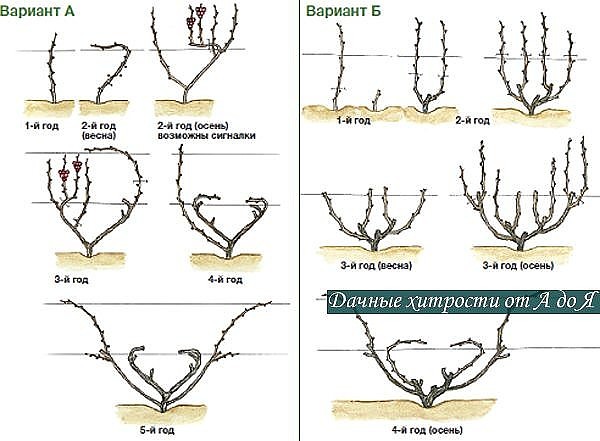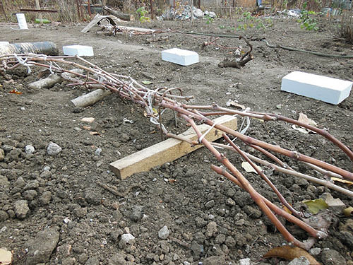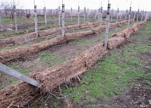 Если на протяжении пяти и больше дней на улице держится температура на уровне -18 градусов Цельсия, это приводит к гибели 70% виноградных глазков. Когда температура снижается до уровня -20 градусов Цельсия, гибнут все глазки, а также однолетние лозы и даже многолетняя древесина. Что уж говорить, если корневище виноградных кустов еще более чувствительно к холоду. Отдельные его элементы будут повреждены даже при незначительном похолодании до -5 градусов Цельсия. В случае обморожения надземных частей куста возможно полное восстановление, но промерзание корней убьет растение, соответственно, рекомендуется утеплить виноград на зиму для сохранения жизнеспособности кустов. Единственным решением, способным уберечь виноград от обмерзания является укрытие. Важно разобраться с особенностями этого процесса в зависимости от территориального расположения посадки. Например, укрытие винограда на зиму в средней полосе не понадобиться, так как в местах, где температура воздуха зимой не опускается ниже показателя в -16 градусов Цельсия, это не имеет никакого смысла. При снижении температуры до -20 градусов Цельсия укрытию подлежат все морозостойкие сорта, если же существует возможность снижения температуры ниже -24 градусов Цельсия, укрытию подлежат все кусты. Осуществить укрывание винограда на зиму можно по-разному. Но в любом случае для начала куст нужно снять со шпалеры, обрезать в соответствии со всеми правилами, о которых речь пойдет ниже, удалить остатки растительности и обработать раствором медного купороса. Если местность характеризуется активностью грызунов, настоятельно рекомендуется закладка отравленной приманки вместе с лозой. Представленные варианты и способы укрытия винограда позволят уберечь кусты от повреждения и сохранить их жизнеспособность до начала периода движения соков. Кусты нужно пригнуть к почве, прижав землей. Не оставляйте их в вертикальном положении, даже укутанные бумагой. Увы, этот материал не защищает от морозов. Такой укрывной материал для винограда на зиму спасет куст только от пересыхания во время морозных ветров. Лозы рекомендуется закапывать во влажную почву, заимствованную из междурядий. Если выбирать почву непосредственно из-под кустов, это оставит корневую систему без надлежащей защиты от мороза. Этот тип укрытия во время теплой зимы приводит к подпреванию и гибели части глазков, поэтому опытные садоводы рекомендуют к применению воздушно-сухой метод укрытия. На каркас или непосредственно сами кусты набрасывается черная пленка. Часто для того же используется пластиковая мешковина. Этот материал отлично показал себя на деле, так как способен пропускать влагу и воздух без образования конденсата. И только после укутывания винограда выбранным материалом можно закапывать кусты почвой. Такая подготовка винограда к зиме подходит для местности с нестабильным температурным режимом, так как при необходимости побеги можно открывать для просушки и охлаждения. Еще один способ укрытия, который практикуется и для хранения саженцев винограда зимой, это засыпать кусты органическим сухим материалом, например, опавшей листвой или соломой, и все затянуть пленкой, присыпав ее землей. Очень важно завершить укрытие до начала первых морозов, ведь в противном случае лоза будет иссушаться и станет ломкой, из-з