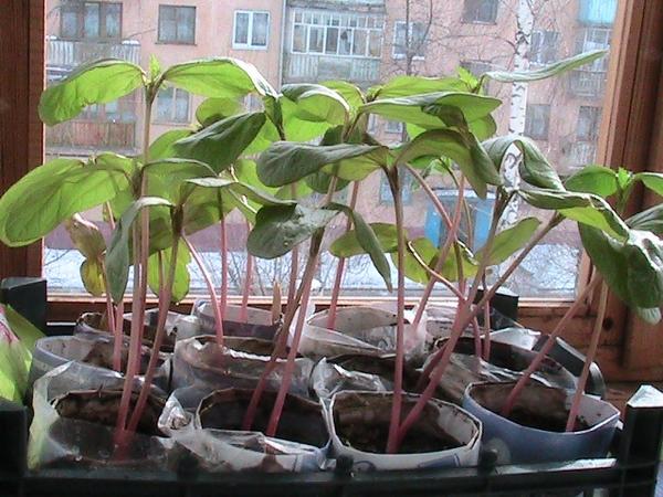 Не менее быстро начинает развиваться и рассада клещевины — еще до того как появляется первый настоящий листик, стебли сеянцев немного вытягиваются. Поэтому, как только у сеянцев наметился первый настоящий листочек, я переношу рассаду в светлое и прохладное место, с температурой не менее +15 °С. По мере стремительного роста сеянца клещевины досыпаю почву до самых краешков ведерка. Несколько раз сеянцы клещевины у меня вытягивались, приходилось переваливать растения в емкости большего размера.