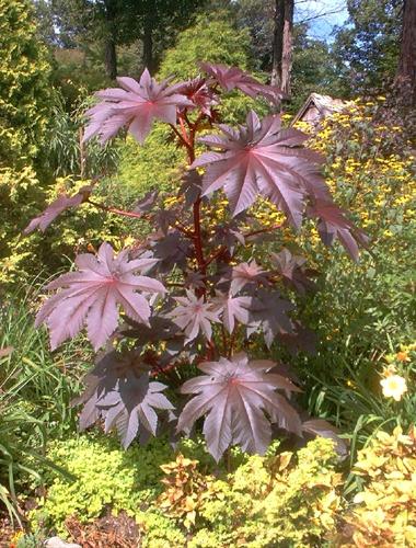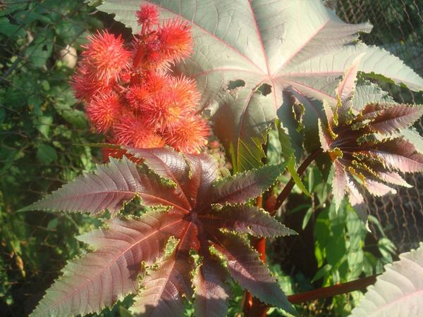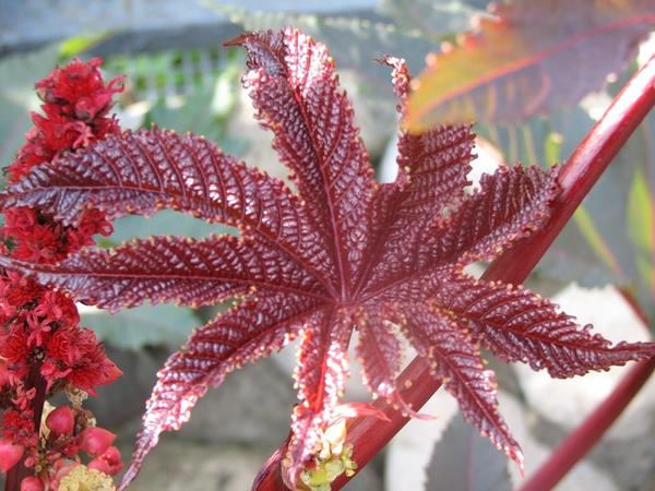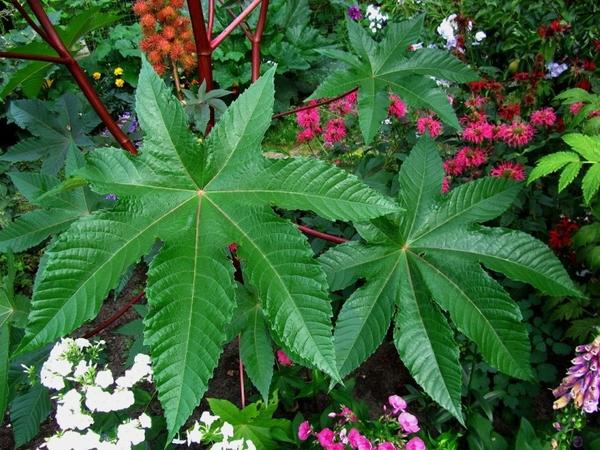 Клещевина занзибарская достигает в высоту 2 м, имеет темно-красные исполинские листья