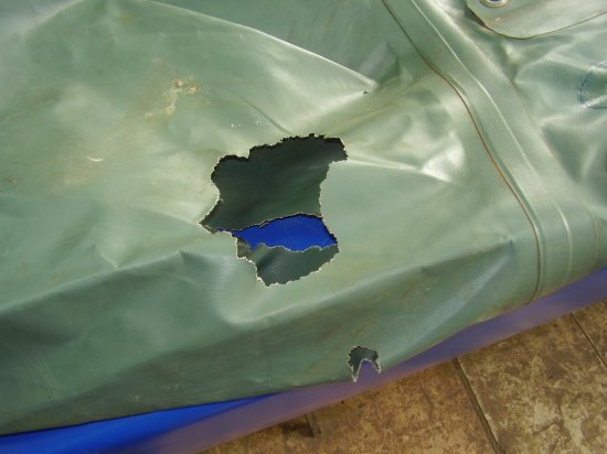 Повреждения на днище достаточно специфичны. Основными их виновниками становятся находящиеся в водоемах коряги, большие ветки деревьев, прутья от арматуры. Такие порезы рваные и имеют сложную конфигурацию. При выполнении их ремонта следует также ставить внутреннюю и внешнюю заплатки. А для точного соединения поврежденных краев можно использовать для сшивания нитки. Сам порядок проведения работ такой же, как при ремонте обычных проколов.