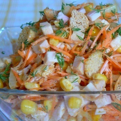 добавить курицу порезанную кубиками ,кукурузу ,перед подачей заправить майонезом и добавить сухарики.