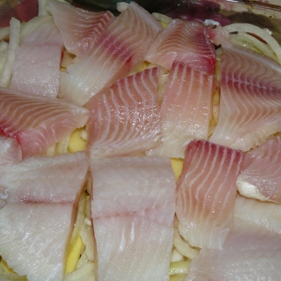 5. В форму сначала выкладываем слой картофеля, затем лучок, затем рыбка.